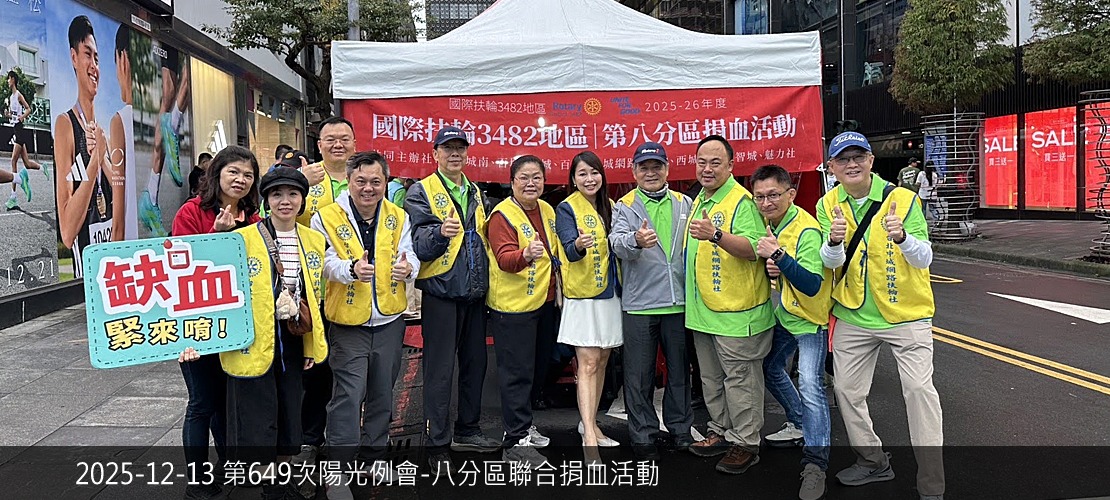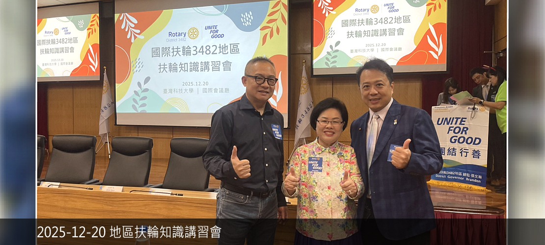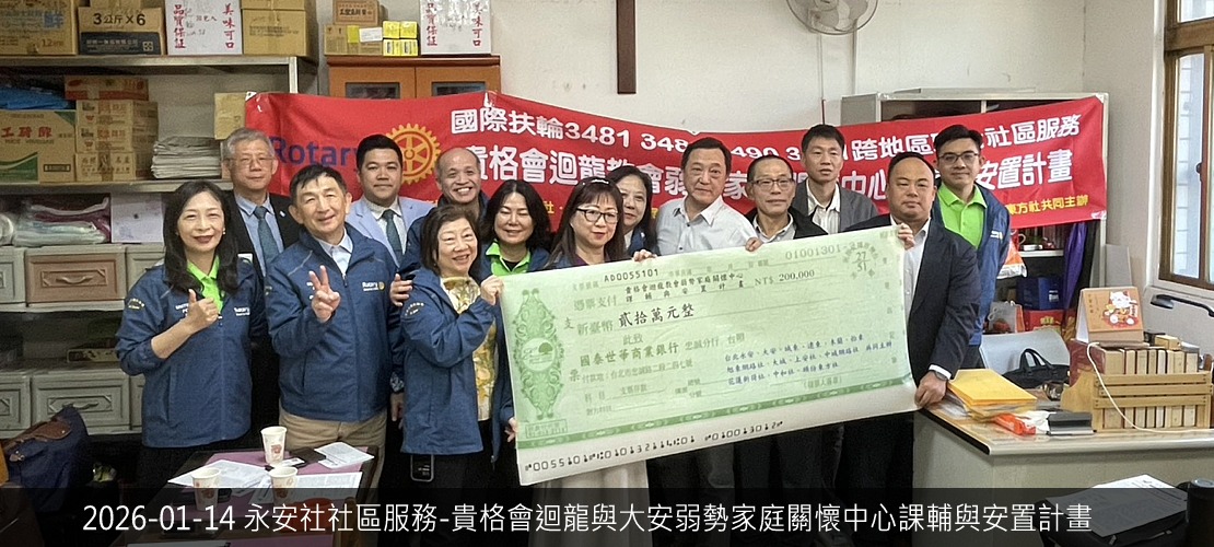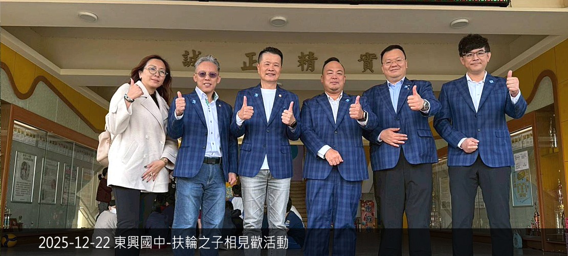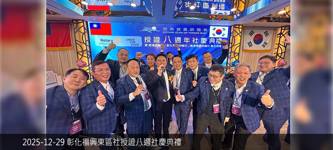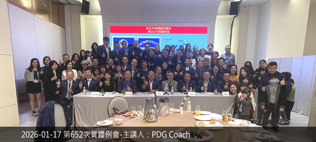 2025-26年度社長:詹傑涵P. Hank 2025-26年度秘書:黃國維S. Winston 活動相片 第653次例會(視訊)鐘啟哲校長為愛走百里介紹 第652次例會(實體)前總監 莊子華PDG Coach2026扶輪國際年會在台北-推廣與參與 永安社社區服務貴格會迴龍與大安弱勢家庭關懷中心捐贈 彰化福興東區社授證八週年社慶典禮 智城社主辦聯合社區服務竹東慢飛家庭114年度心智障礙者太平鼓舞計畫 東興國中扶輪之子相見歡活動 2025-26年度地區扶輪知識講習 第650次例會冬季旅遊暨社員大會 職業參訪P. Hank 公司醫兆股份有限公司 第649次例會(陽光)第八分區聯合捐血活動 西城社主辦社區服務老人送餐服務暨經費捐贈活動 第648次例會(視訊)主講人:陳聖文 Max講題:一窺腕表的精彩 more.....