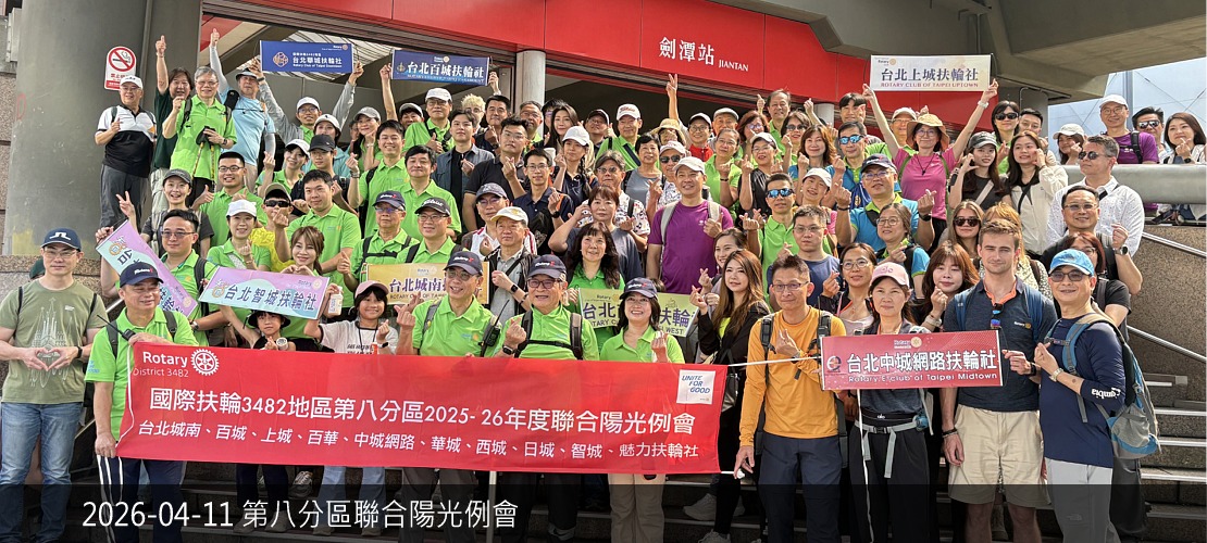 2025-26年度社長:詹傑涵P. Hank 2025-26年度秘書:黃國維S. Winston 活動相片 第八分區聯合陽光例會登山活動 第662次移動例會(職業參訪)PP Chad 公司 華城社授證9週年社慶典禮 第八分區聯合社區服務二手義賣會 地區優良社友職業成就表揚金鶴獎頒獎典禮 社長當選人學習研討會PELS 第659次例會陽光例北海岸一日遊 城南社授證30週年慶祝晚會 more.....